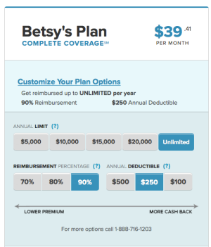 You can see the annual maximums they now offer and also a policy with no limits. You can also see the options available for reimbursement percentages and annual deductibles. Also observe that the premium to insure the cat the same age and with the same coverages costs about 1/3 less than to insure the dog. With most, if not all, pet insurance companies, it costs less to insure a cats than dogs. My impression is that these premiums are very reasonable and should compare well with other companies for similar coverage.